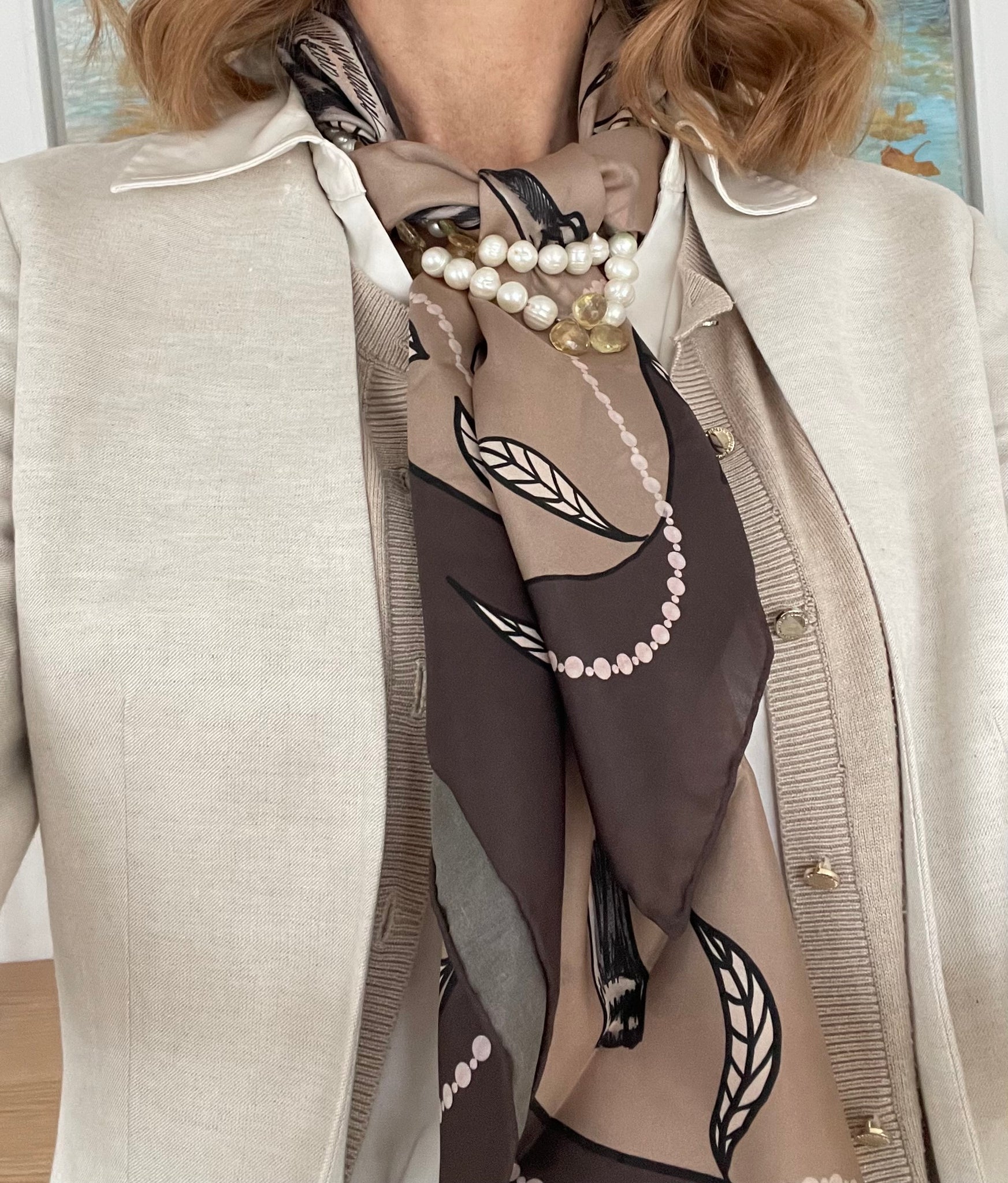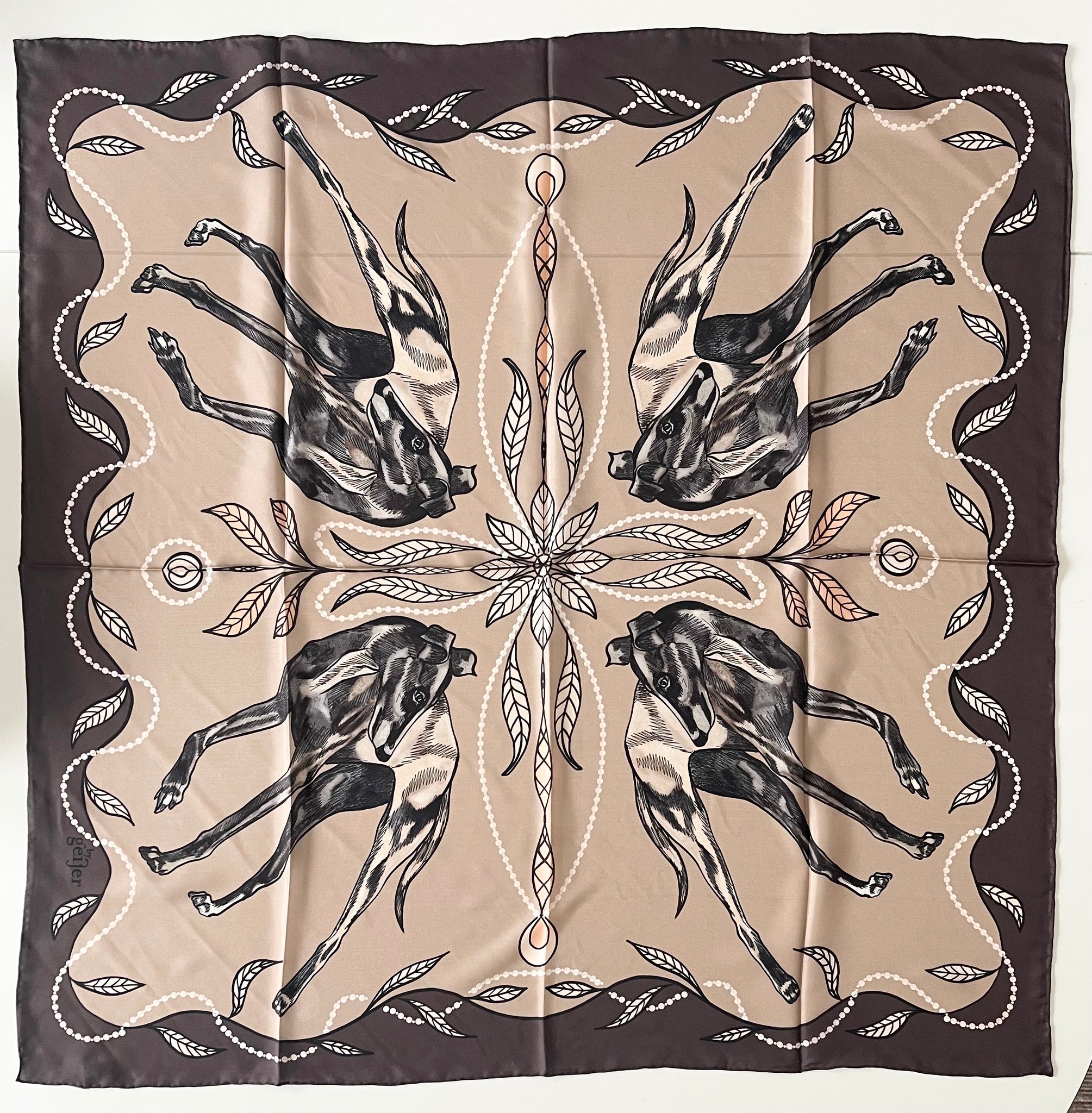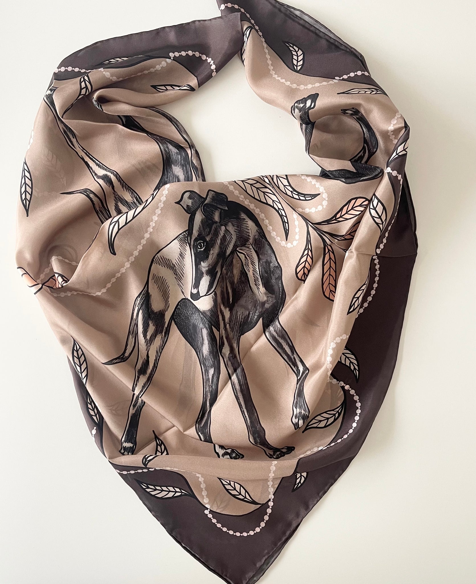 Underbart vacker sjal i 100% siden i härligt höstiga toner i beige, gräddvitt och chokladbrunt med stiliga hundar och pärlor.
